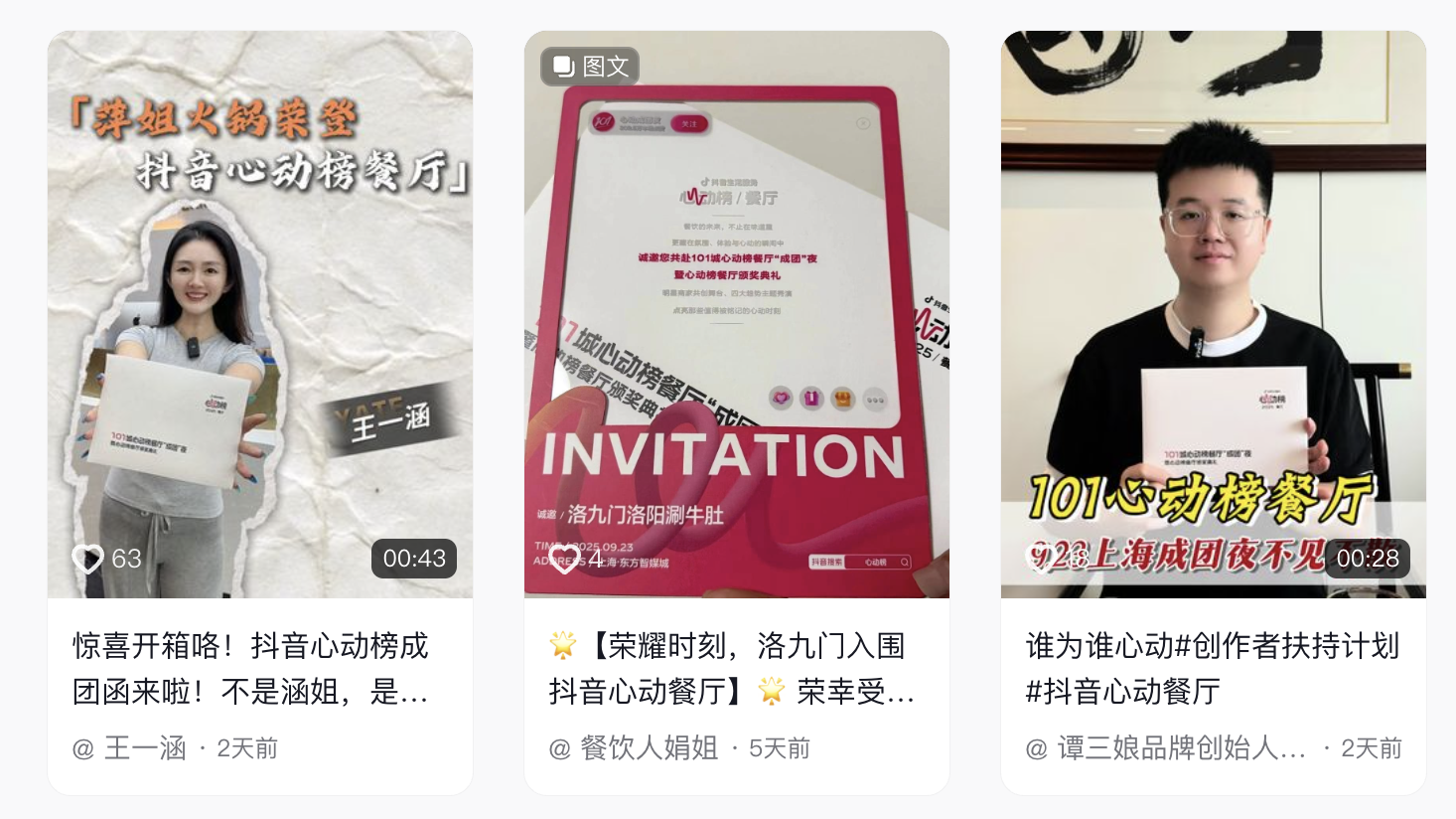 通过趋势洞察与榜单赋能,结合持续创新的营销方式,抖音生活服务心动榜餐厅正将美食真正转化为一种新型的社交货币,让好餐厅被看见、被找到、被分享。在不断满足这届吃喝脑袋们的兴趣和需求的同时,引领行业共同书写新的「心动」篇章。
