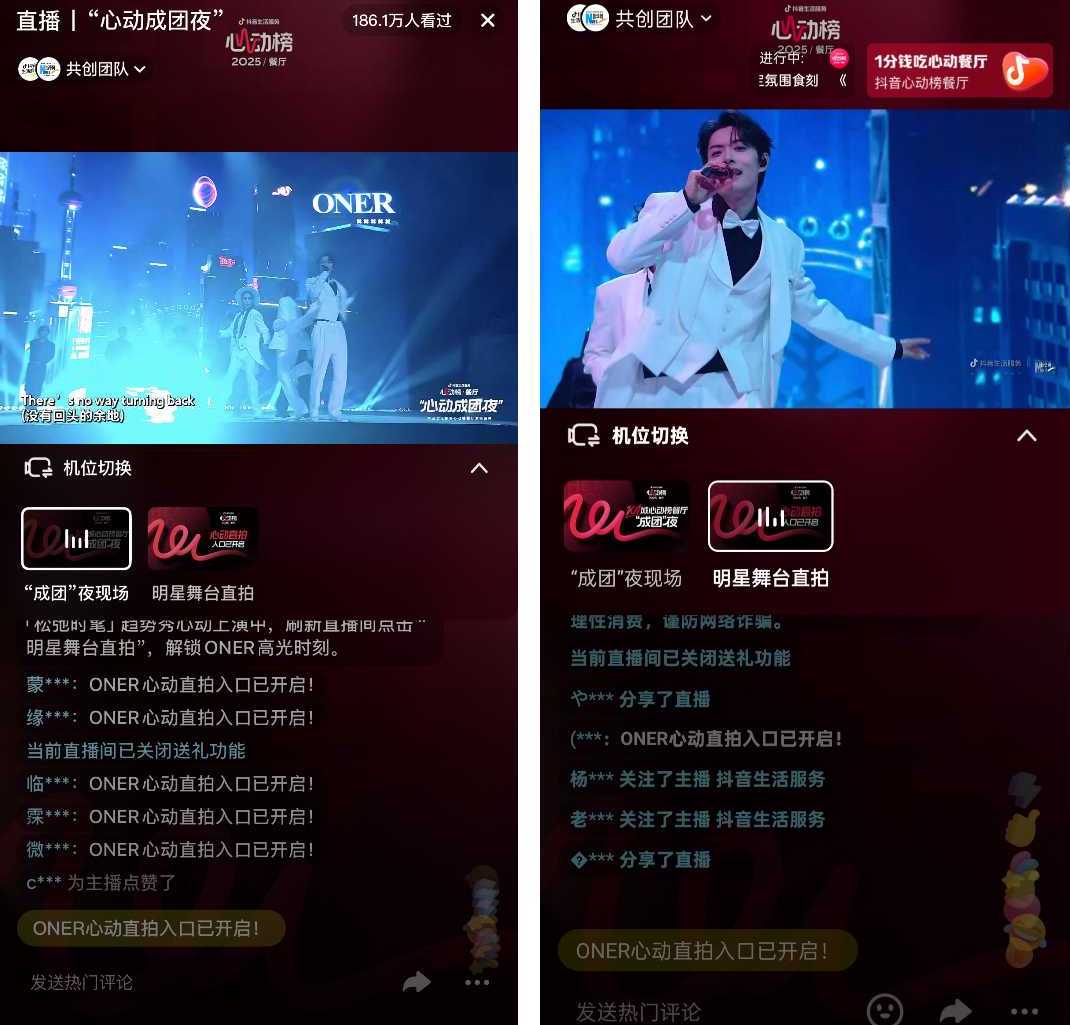 与明星、商家共创趋势舞台外,「心动成团夜」还通过丰富的直播互动玩法,激发大量用户线上参与,并创新打造双屏联动模式——主舞台与明星直拍机位实时衔接、内容直播间与交易直播间无缝协同,在满足多元观演需求的同时,高效实现内容热度向销售转化的承接。