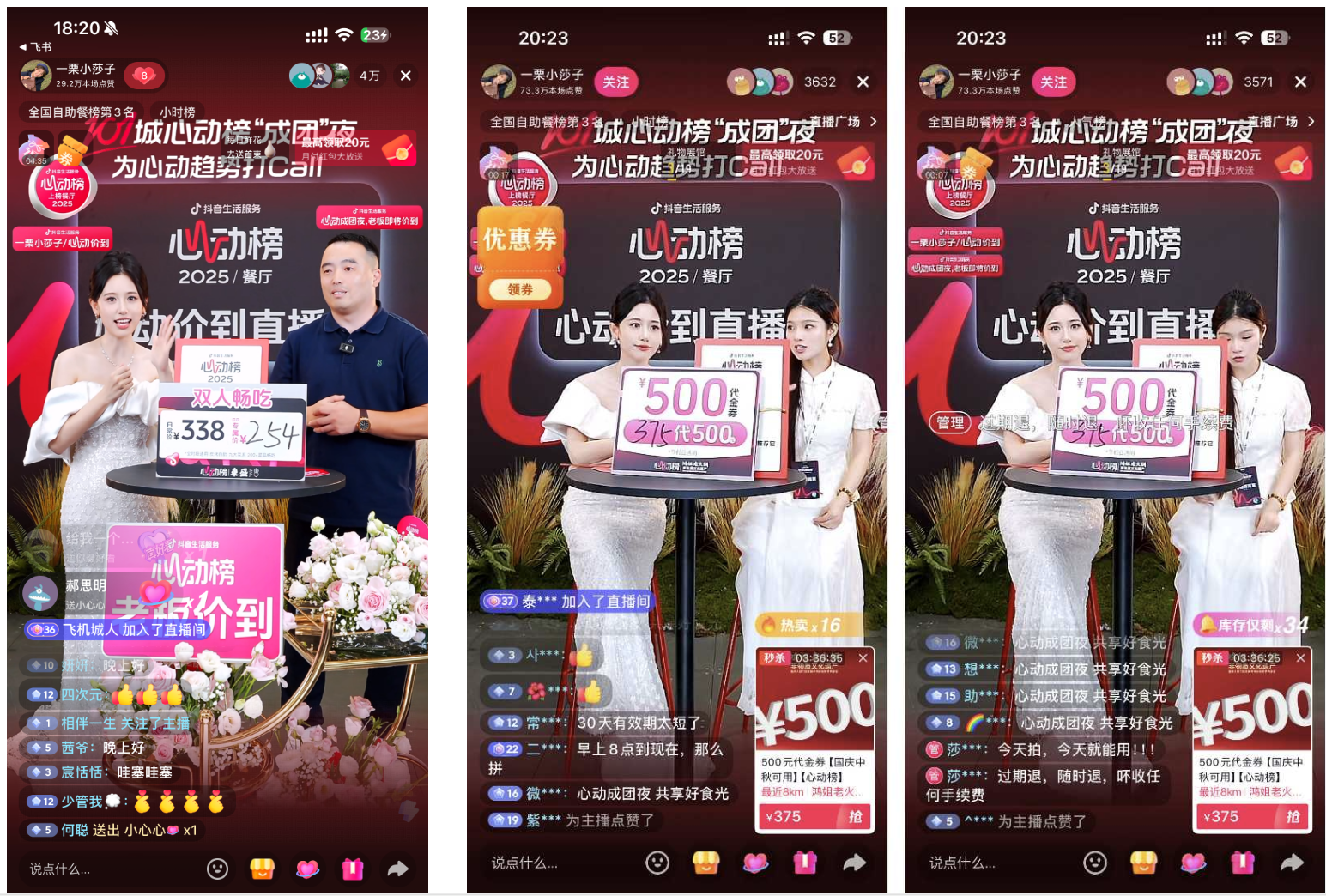 可以看到,凭借双屏直播联动的内容模式,以及商家自播间的外围承接,「心动成团夜」不仅将晚会舞台与站内直播生态深度互通,更将这场盛典延伸为上榜餐厅集体爆发的「冲锋日」,达成品牌出圈与销量增长的双重共赢。