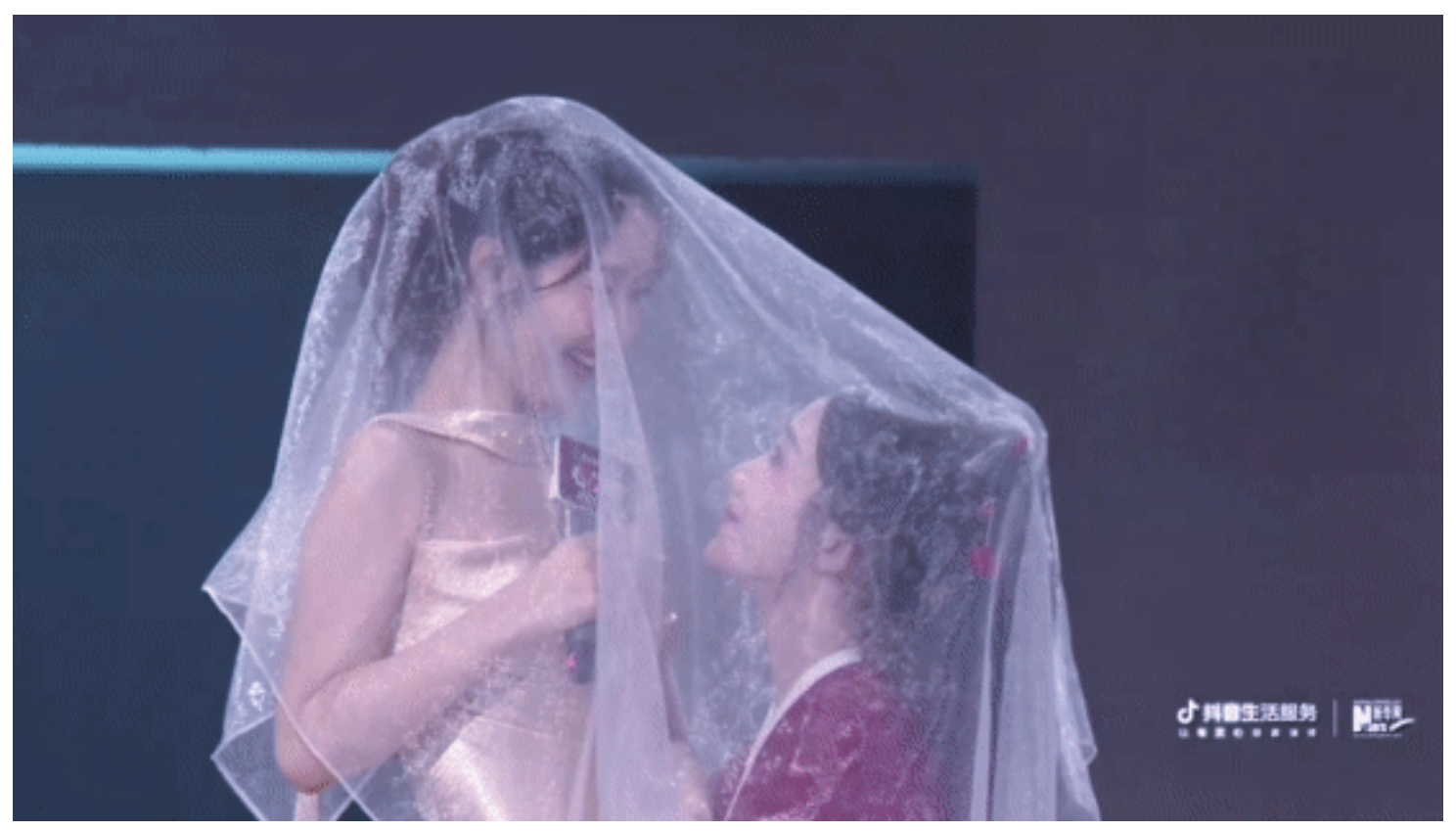 表演结束后,她再次回到现场演绎其火遍全网的头纱舞,与女主持人亲密互动。观众也被她的舞蹈所感染,直播间充斥着「这谁看不迷糊啊」「跳得太美了好想去现场看」等真情实感的发言。与此同时,她的个人抖音账号及其门店抖音号视频点赞量日环比均实现了 40%+的增长。