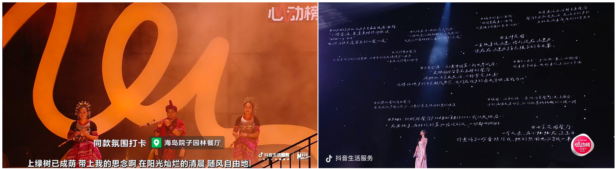 好看有氛围的店外窗景,也是不少消费者选择餐厅的重要因素。因此,抖音生活服务在部分舞台的背屏上,将心动榜商家的真实窗景放置其中,例如外滩 701 观江餐厅窗外的摩天轮、杭州南山顶层酒馆可见的城市夜景、Malt Café 内的洞穴海景等,直观传递上榜餐厅的心动氛围,引导观众到店打卡同款。