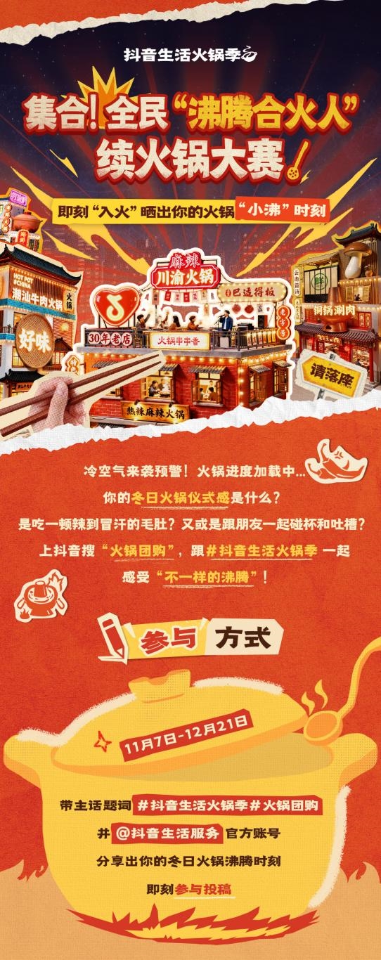 这个冬天,跟着「抖音生活火锅季」一起,开启不一样的“沸腾”吧!约上三五好友“入火”开涮,在热闹的烟火气里说说笑笑,看各色食材在锅里翻滚,和朋友在桌边畅饮碰杯……生活的惬意与火锅都在这一刻沸腾!即日起上抖音搜索「火锅团购」,多种大牌火锅好价吃到爽,各色趣味玩法“沸腾”到心坎,记得持续关注「抖音生活火锅季」活动!