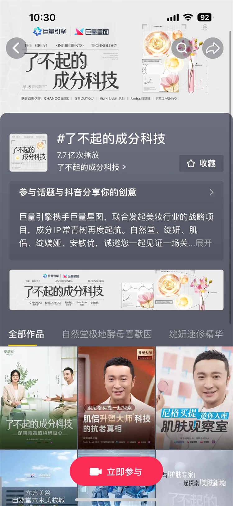 光看懂还不够,得让人信,项目直接拉满顶格信任!先是联动皮肤科专家推出先导片,不搞空泛解读,而是就大众所关心的【都是你想问】护肤知识,展开深度解读,看个短视频轻松学到不少护肤知识,最重要的是皮肤科专家免费给上课。同时还拉上了央视文艺、央视频权威背书,直接把成分科技的可信度抬到国民级高度。