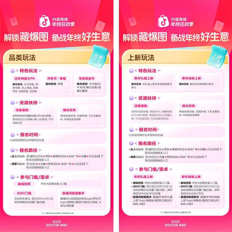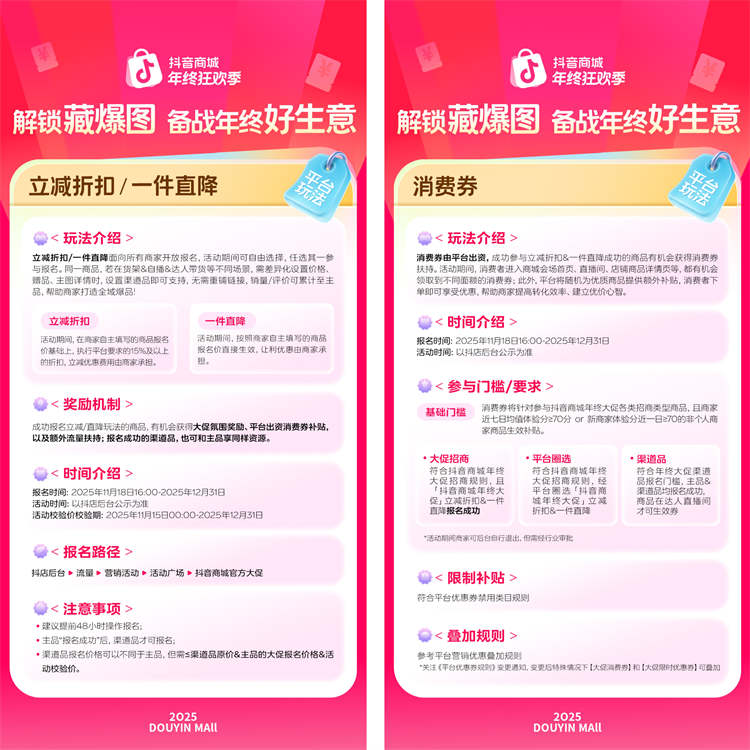 承接双11大促的强劲势头,「2025抖音商城年终狂欢季」招商正火热进行中,并于12月3日正式开启年终促活动。商家、达人可紧跟平台节奏,参与大促玩法,借力平台扶持,抢先布局蓄水,打赢全年收官之战。