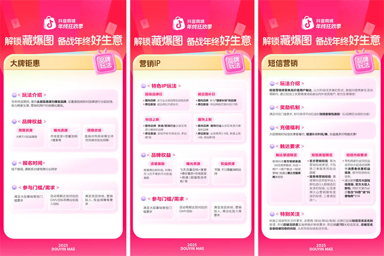 年终消费旺季将至,「2025抖音商城年终狂欢季」也将在12月3日正式启动。这不仅是商家冲击年度目标的关键节点,也是布局新增长的黄金窗口。为助力商家把握增长机遇,活动发布年终大促“藏爆图”,从价格力、内容力、爆发力、营销力等多个维度,为商家备战「2025抖音商城年终狂欢季」提供清晰指引,助力商家在激烈竞争中赢得确定性增长。