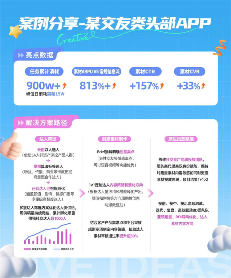 在非游领域中,社交与工具行业对高质量原生内容的需求尤为强烈:社交行业需持续输出涵盖情感联结、内容互动、功能传播等多场景内容;工具面临创意形式单一、素材生命周期短与规模化跑量难以兼顾的挑战。「星广联投」通过平台智能连接海量创作者,为社交、工具行业提供稳定、多样化的原生视频素材供给,填补素材内容缺口,精准挖掘增长新机会。