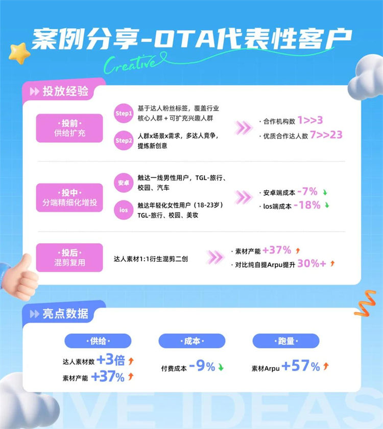 某OTA行业客户借助「星广联投」,实现了分端精细化投放,转化成本更低的同时实现了量效双赢。在投前阶段,品牌依据达人粉丝标签精准扩充供给,合作的机构数量与优质达人数显著增加;投中则分端精细化运营,安卓与iOS成本双降;投后通过混剪复用进一步提升素材效率。最终达人素材数增加3倍,素材ARPU提升57%,成功打造了可复制的投放模型。