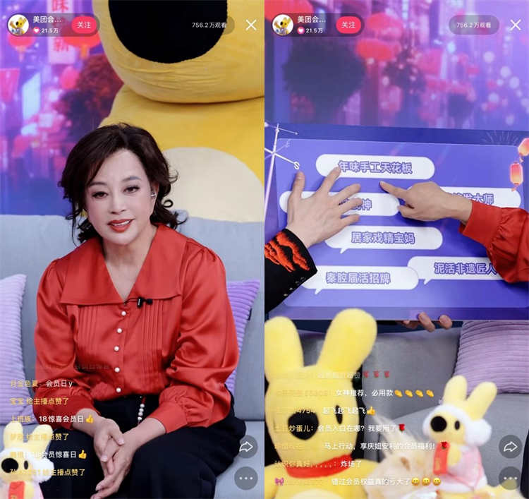 围绕春节前最真实的生活需求,直播以“美丽、美味、整洁、心情”为线索,通过多位线上线下达人轮番连麦,将分散的会员权益自然嵌入具体场景之中。刘晓庆作为贯穿全场的发布官,持续承担起连接与引导的角色,让权益释放始终保持在同一叙事节奏内。