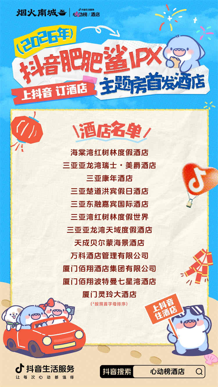 抖音生活服务携手肥肥鲨IP,正式推出 【抖音肥肥鲨IP主题房】,并公布了首发合作酒店名单。本次首发覆盖厦门、三亚两地共13家酒店,包括海棠湾红树林度假酒店、三亚康年酒店、厦门佰翔酒店集团有限公司等特色度假酒店。这不仅仅是在房间里主题展示,而是一场“IP内容赋能+多场景体验”的创新之旅,旨在为家庭用户打造一个沉浸式、有故事、能玩乐的独特度假场景,让每一次亲子出行都充满惊喜。