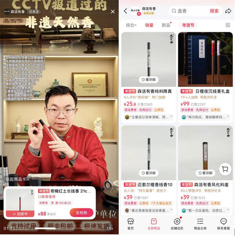 在内容场成功吸引潜在用户关注后,@森活有香 乘势而上,积极报名年货节消费券活动,以更具吸引力的价格降低用户决策门槛,进一步激发用户购买欲望。并优化“线香”相关搜索关键词布局,将直播间激发的购物兴趣高效引导至货架场景实现转化,商品卡支付GMV环比增长近250%。