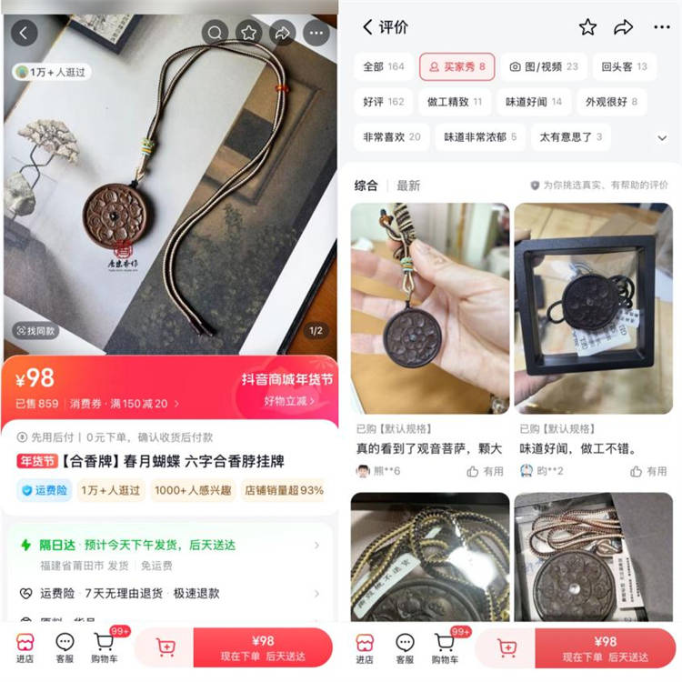 为打破传统香类产品的品类局限,商家大胆创新,将古法制香工艺与现代配饰审美相融合,创新推出香牌、耳饰、挂件等“可上身”的系列单品,契合目标用户对个性化、有文化感配饰的需求。更重要的是,@唐宋香作 没有刻意营造非遗的距离感,而是让每一位使用者都成为商品的传播者,鼓励其分享“买家秀”,将真实消费体验沉淀为持续发酵的好口碑,形成了“购买-分享-引流-复购”的正向循环。