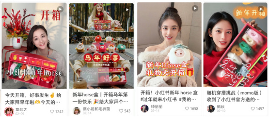 小红书还特意设计制作了系列地域特色小红薯“娃衣”,送出马年新年“Horse盒(好事盒)”:喀什的棉花薯,广东的虾饺薯、辽宁的草莓薯、南京的萝卜薯、福州的爱心树薯和泉州的锦鲤薯。百位明星博主发布“Horse盒”拆箱视频,进一步推高线上线下活动热度。