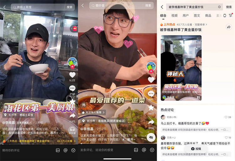 除了政务联动,明星探店更是为湘菜引流添柴加火,让长沙味道彻底出圈。本土熟面孔李维嘉强势加盟,带来系列探店内容,用接地气的讲解、沉浸式的品尝,带大家走进长沙街巷深处的两处宝藏湘菜馆——艳姐土菜馆、易姐蒸菜,解锁藏在烟火里的地道风味,每一条视频都充满烟火气与趣味性,精准戳中网友味蕾,无数网友被李维嘉种草了黄金蛋炒饭。