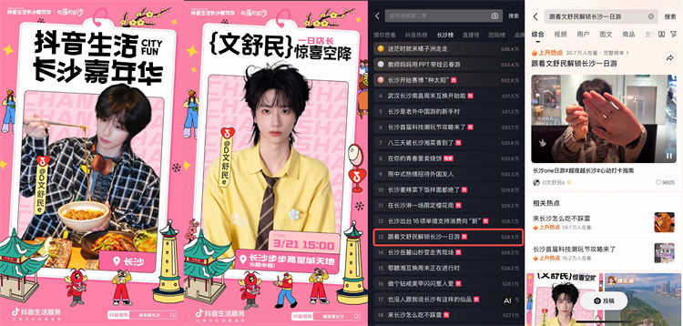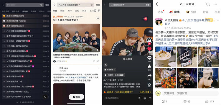 更值得一提的是,凭借城市强力宣传资源,八三夭团队首次与抖音生活服务达成合作,借着乐队新发专辑的热度,打造了一支趣味十足的湘菜探店视频。视频中,八三夭成员沉浸式品尝长沙湘菜,被地道风味狠狠圈粉,相关内容不仅铺满长沙热门湘菜绿草地重点商圈的抖音物料,更成功上榜长沙城市热点#八三夭被长沙湘菜香到了,让湘菜味道借着明星热度,飘进了万家灯火中。