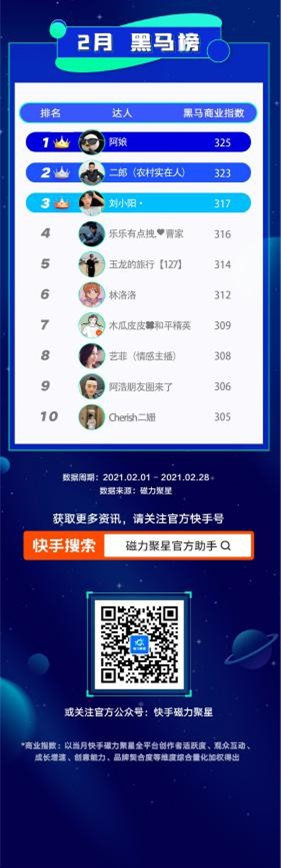 快手磁力聚星2月榜单发布:达人领域和视频内容呈多元态势