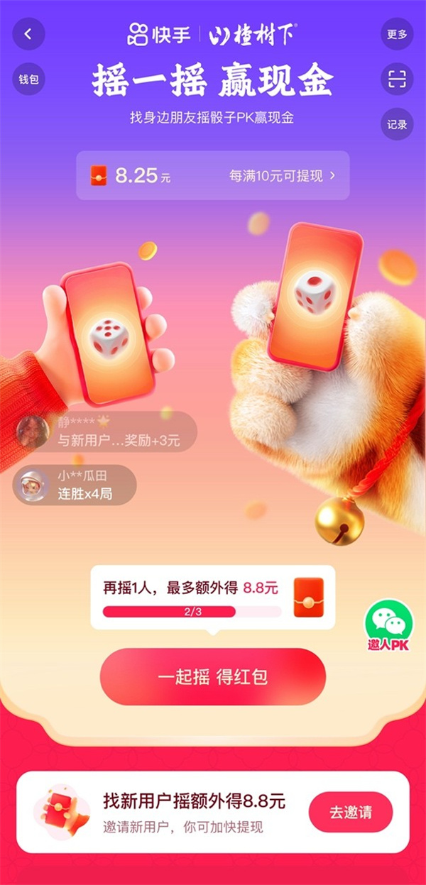 “摇一摇”玩法需要用户找到附近好友通过摇骰子的方式进行PK,获胜一方有机会赢取现金,有了它,再也不担心过年在家和亲戚面面相觑了。