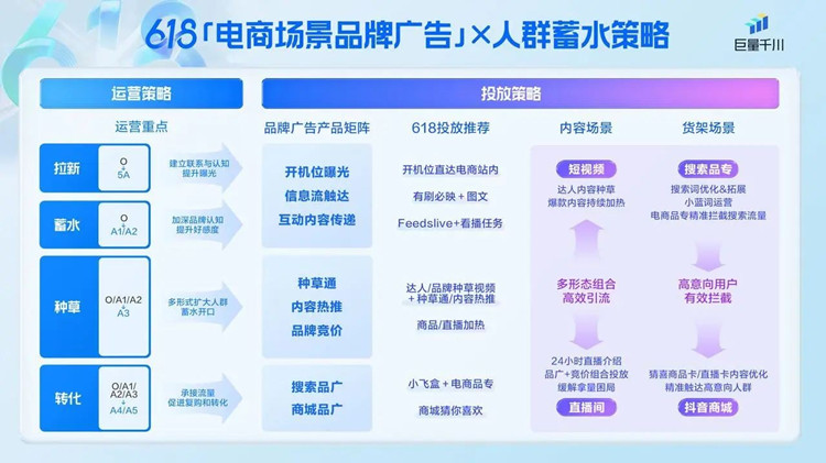 当下正是人群蓄水的黄金节点,巨量千川也为商家推出“人群蓄水策略”,一图了解不同阶段产品应用组合。