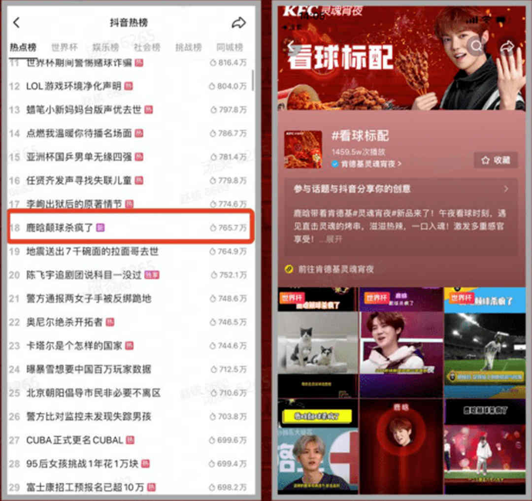 去年11月,世界杯受到了球迷,尤其是年轻群体的广泛关注。肯德基联合抖音心动观赛季,打出“肯德基灵魂宵夜,看球标配!”的口号,让“灵魂夜宵再上新”,同步推出多款新品、性价比套餐,同时在11月18日邀请品牌代言人鹿晗开启抖音专场官方直播,和大家一起“撸串”“聊球”,最高在线人数超6万人,IP成功“破圈”,深入人心。