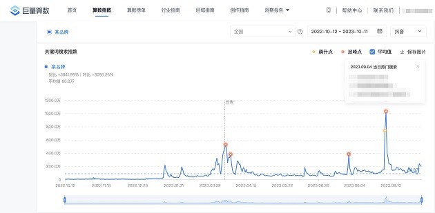 品牌在制定其市场营销策略前,往往会研究最近的行业热度趋势,而在营销活动上线或产品发布后,则需要密切追踪行业舆情的变化。巨量算数指数模块提供了关键词购买服务,同时具备品牌营销事件如品牌名、产品名等相关关键词的查询功能,帮助品牌迅速获取指定时间段内营销内容热度的变化趋势,为营销决策提供基于数据的科学依据,从而助力广大营销从业者绘制更清晰的品牌推广脉络图。