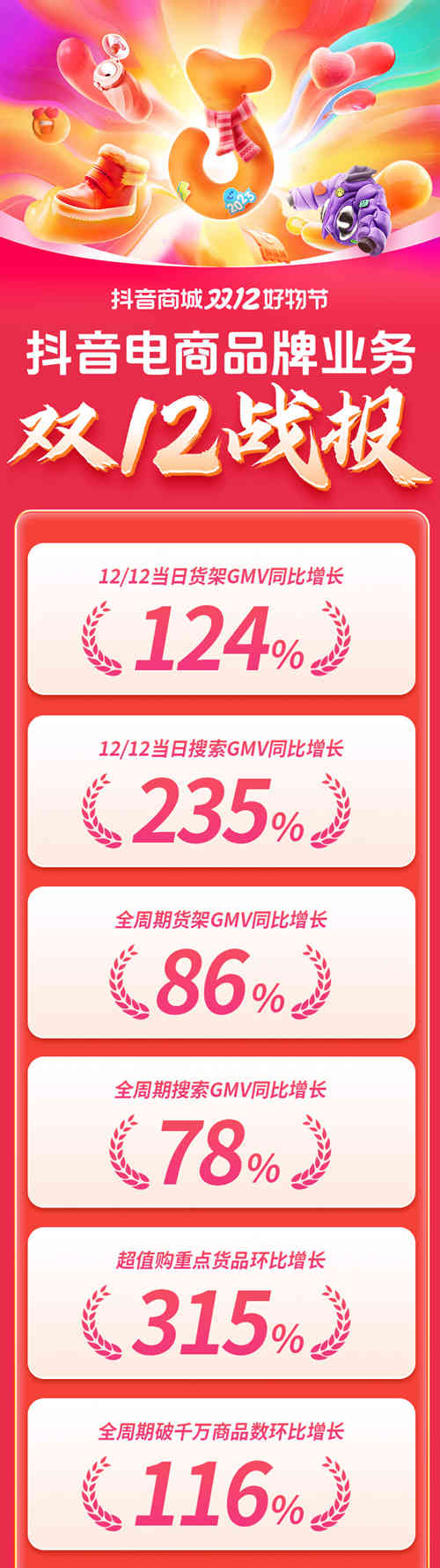 12月12日当天,抖音电商品牌业务货架GMV同比增长124%,搜索GMV同比增长235%;双12全周期货架GMV同比增长86%,商城潜力得到进一步验证,其中超值购频道的重点货品GMV环比增长315%。成交破亿的品牌、单品不断涌现,越来越多的品牌在抖音电商找到大促生意的经营之道,实现“品销”合一。